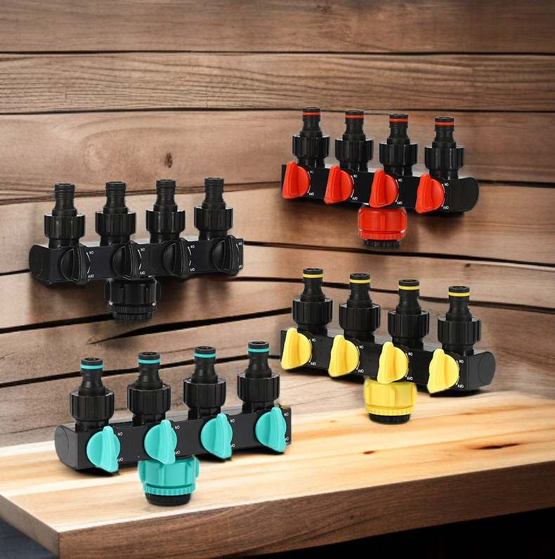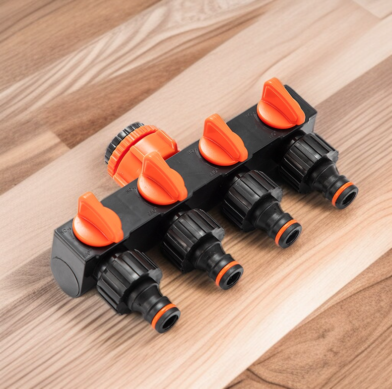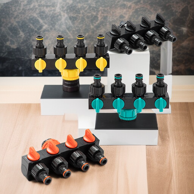 5통 4로 1구 이음매 분수기 수도관, 세차 수도관 스위치 부착, 다양한 분류와 호환, 손쉬운 설치, 내구성 우수, 수도꼭지 커넥터로 효율적인 물 분배 가능.